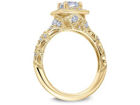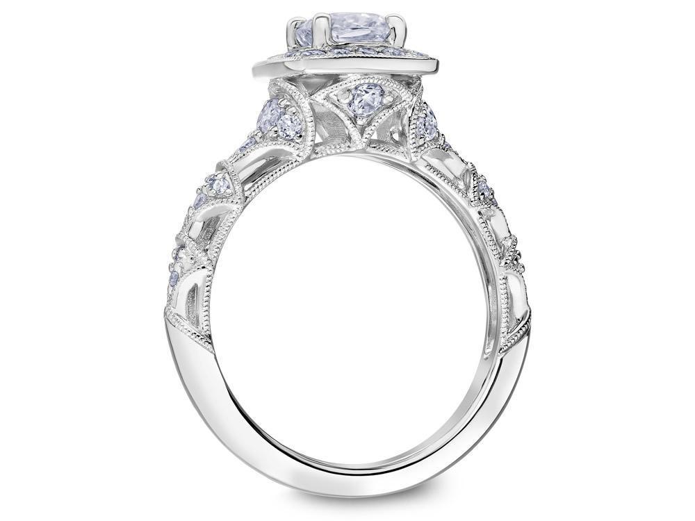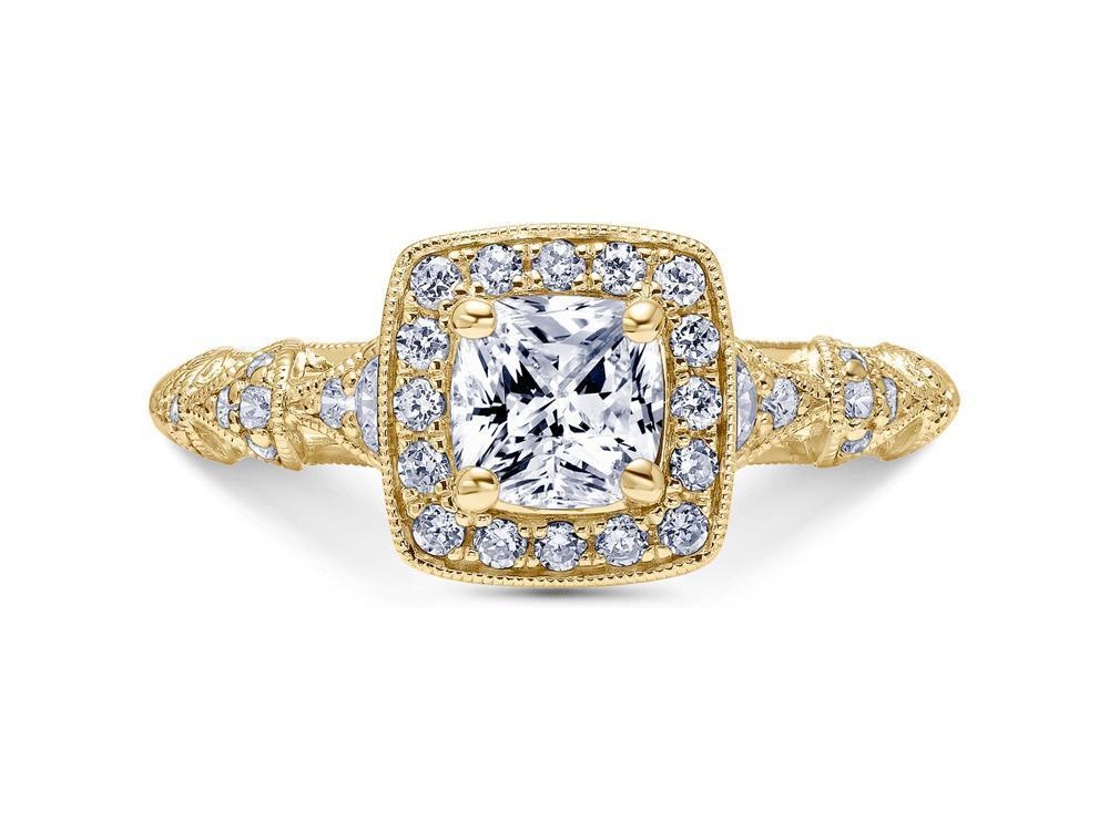 Engagement ring with cushion-shaped diamond halo and open arches down the shank with milgrain accents