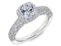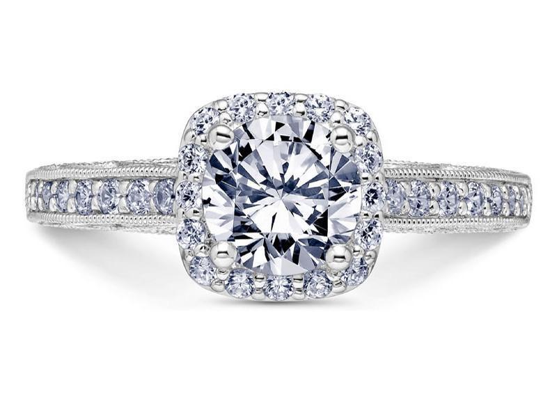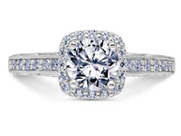 Engagement ring with a cushion-shaped diamond halo and diamond shank with milgrain diamond arches in the gallery