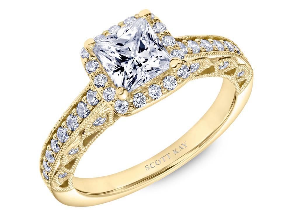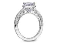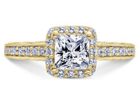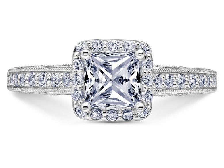Engagement ring with a princess-shaped diamond halo and diamond shank with milgrain diamond arches in the gallery