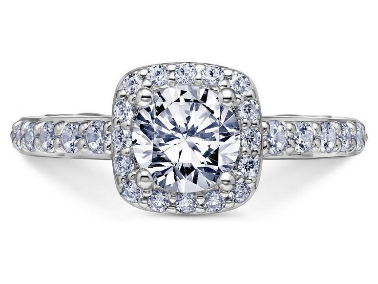 Engagement ring with a cushion-shaped diamond halo and diamond shank with ribbon accented gallery
