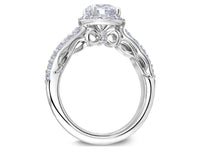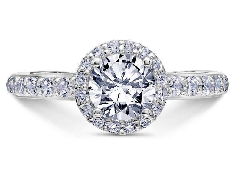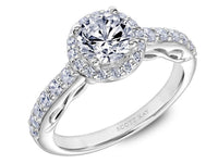 Engagement ring with a round diamond halo and a diamond shank with a ribbon accented gallery