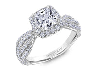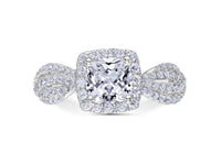 Engagement ring with cushion-shaped diamond halo and diamond twist shank