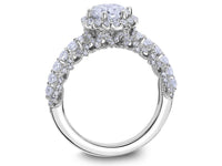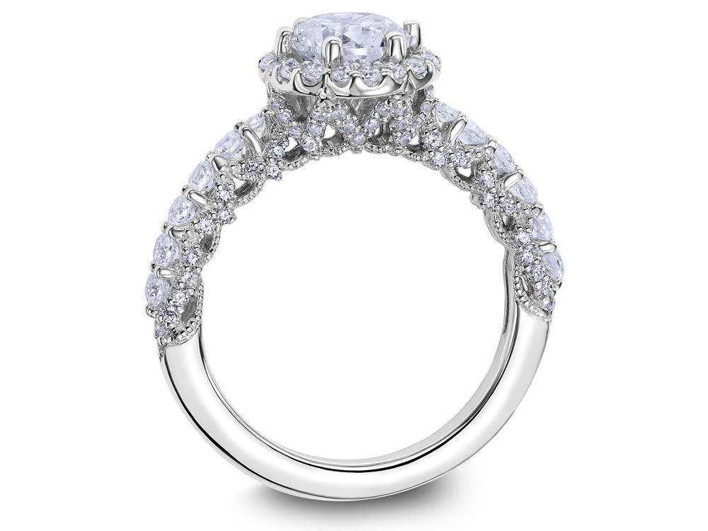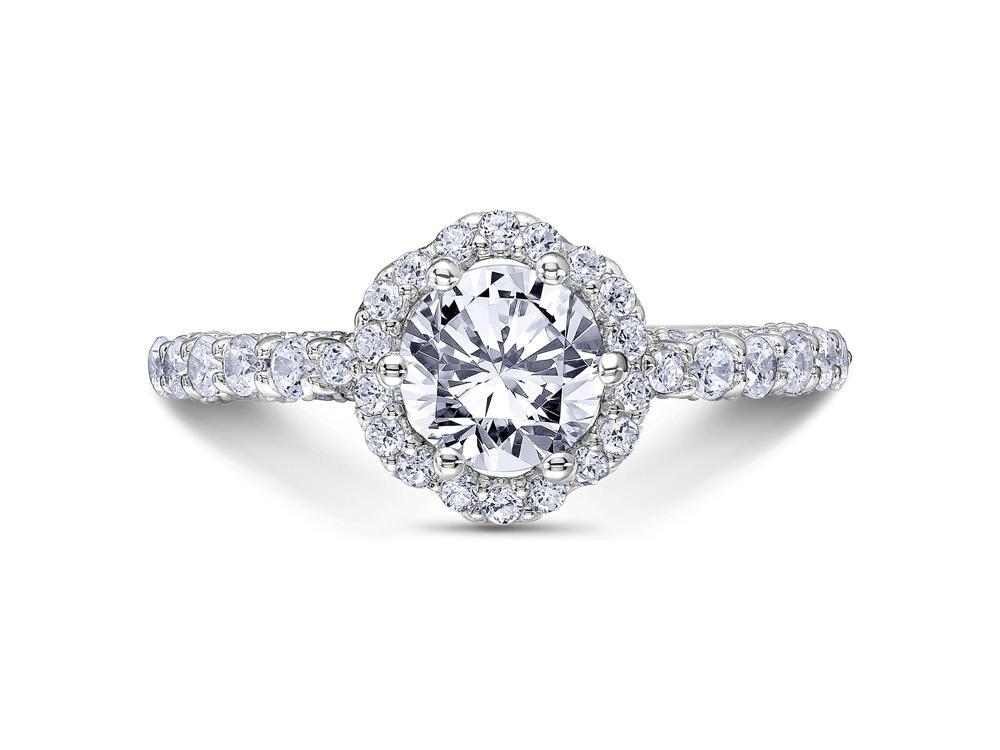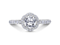 Engagement ring with a round diamond halo and a diamond shank with open archways in the profile