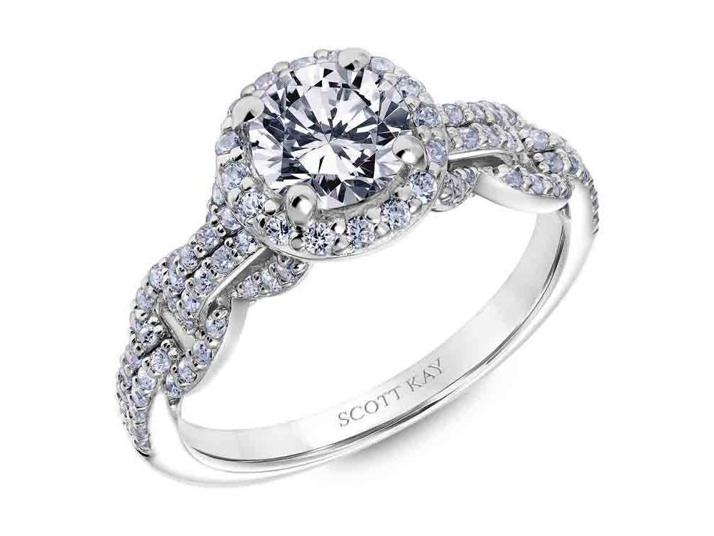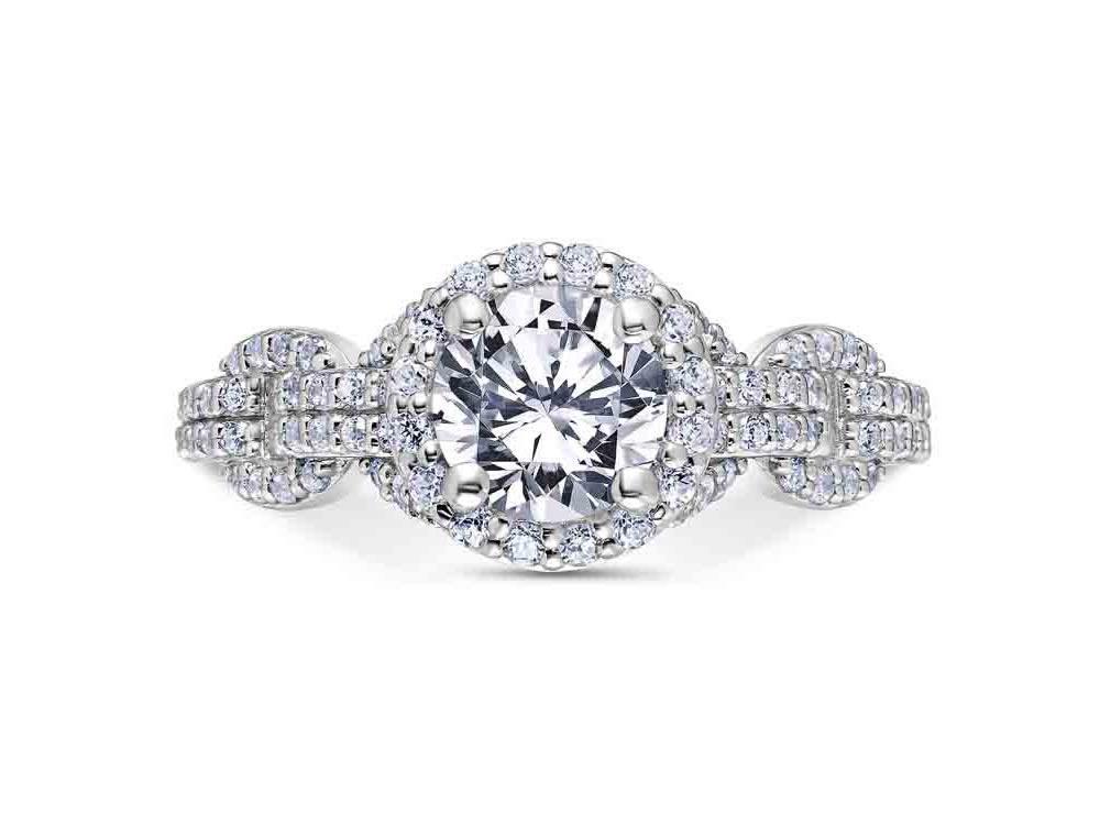 Engagement ring with round diamond halo with diamond encrusted links down the shank