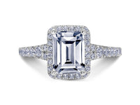 Engagement ring with diamond emerald shaped halo and diamonds down the shank