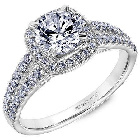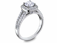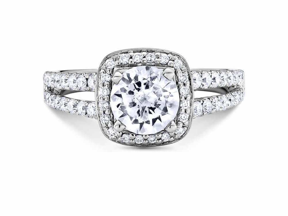 Engagement ring with cushion-shaped diamond halo and diamond split shank