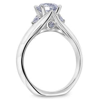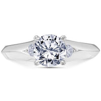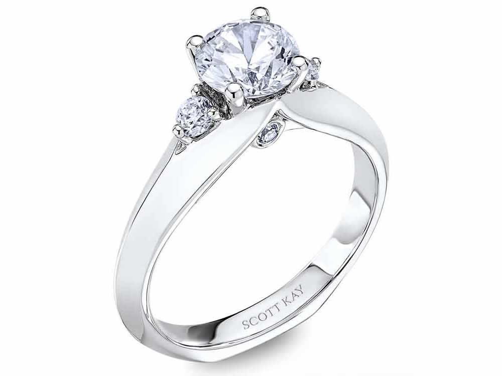 Three stone engagement ring with polished knife-edge shank and bezel-set surprise diamonds in the gallery