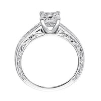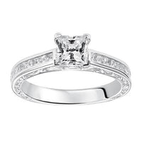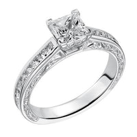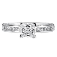 This princess cut engagement ring fuses modern and vintage style with its princess cut channel set band with engraving.