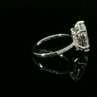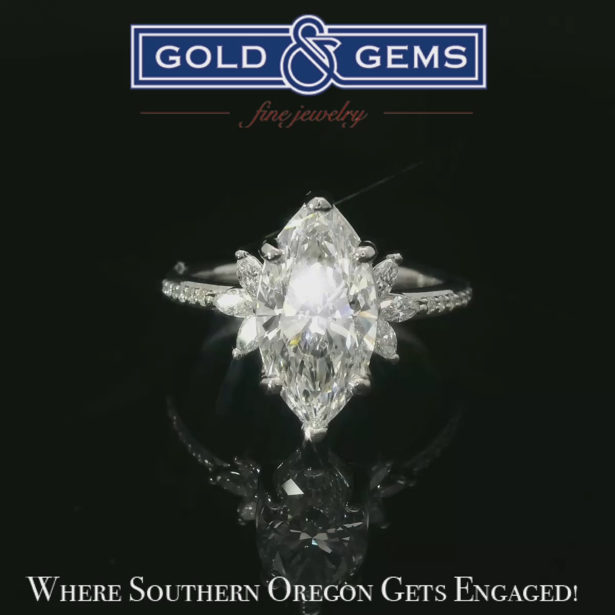 This exquisite marquise cut diamond ring captures the essence of elegance and sophistication. The brilliant center diamond is supported by 6 smaller Marquise cut diamonds & a pave’ shank, creating a dazzling effect that is unique from most rings. This engagement ring symbolizes quality and love…with style.