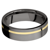 7 mm wide/Flat/Tantalum Noir band with one 1 mm Off Center inlay of 14K Yellow Gold.