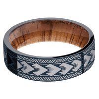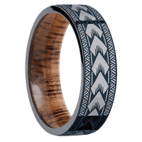 7 mm wide/Flat/Tantalum band with a laser carved Maori pattern also featuring a Koa sleeve.