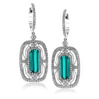 These eye-catching earrings feature an intricate design with sparkling diamonds set around a beautiful green tourmaline.