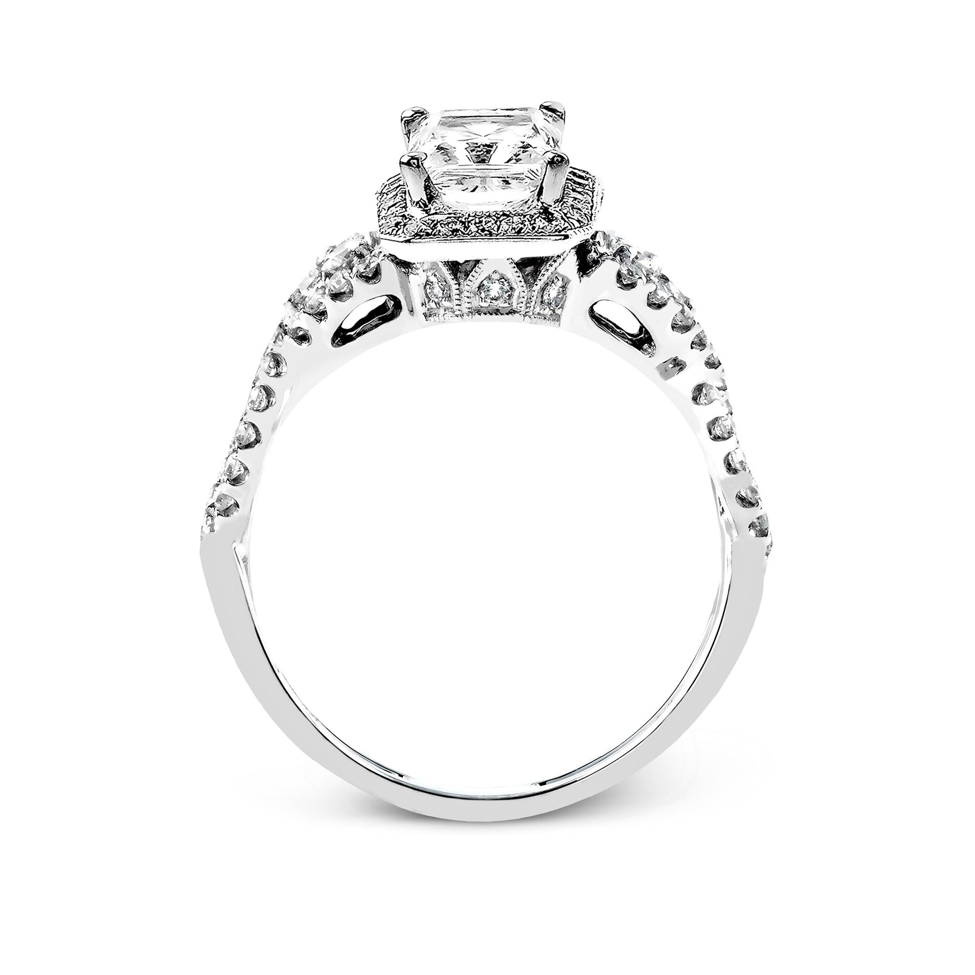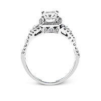 Featuring an intricate, modern design, this remarkable engagement ring is emphasized by a lovely halo and shimmering white diamonds.