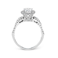 Featuring an intricate, modern design, this remarkable engagement ring is emphasized by a lovely halo and shimmering white diamonds.