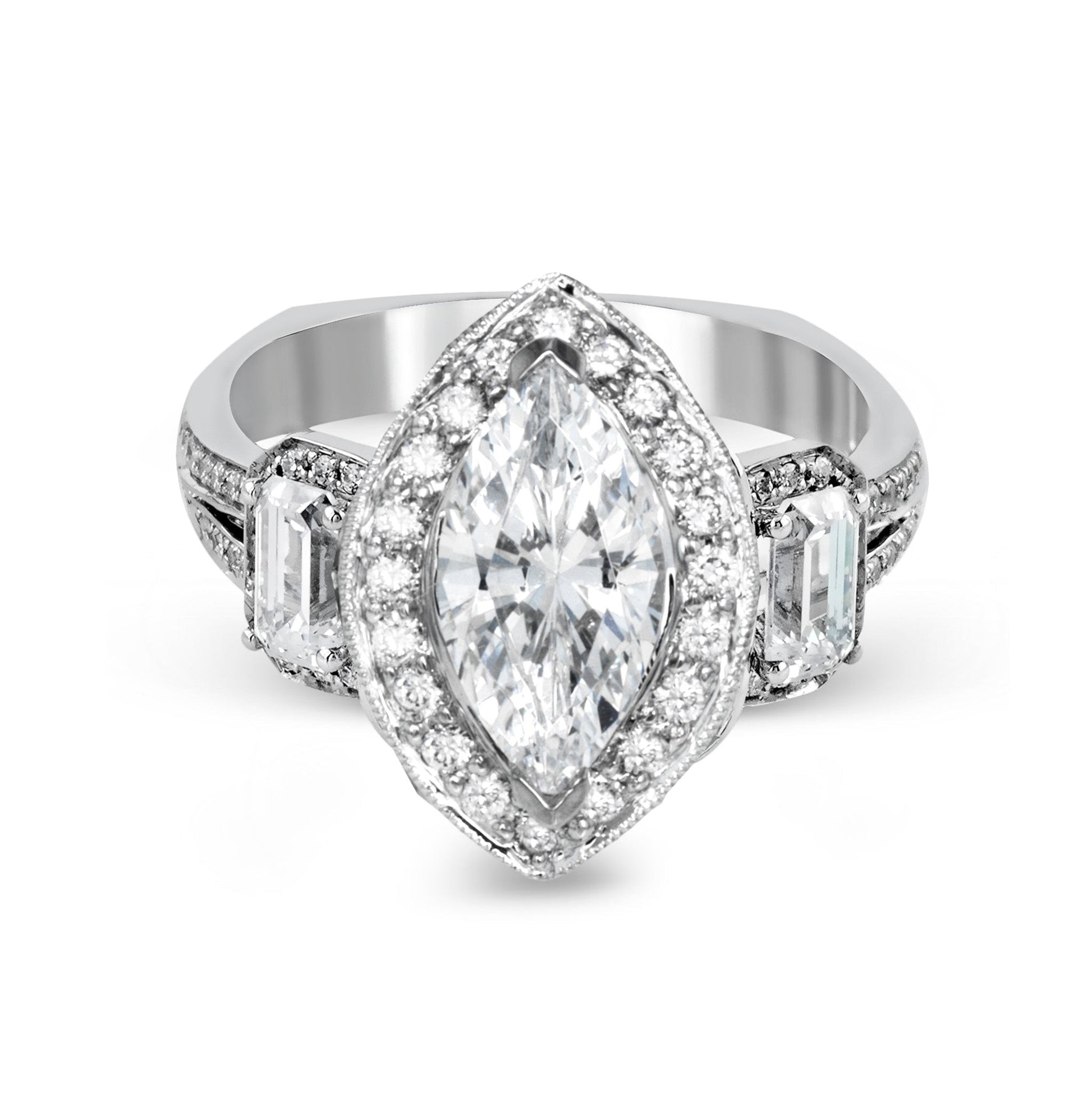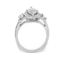 This impressive engagement ring features a halo design along with brilliant emerald side diamonds and sparkling round diamonds.