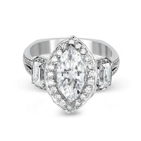 HOME / Marquise-Cut Three-Stone Halo Engagement Ring In 18k Gold With Diamonds