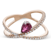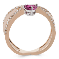 This modern 18k rose gold ring features a .61 ctw pear shaped ruby stone set against an angle, and is accented by .22 ctw of white diamonds.