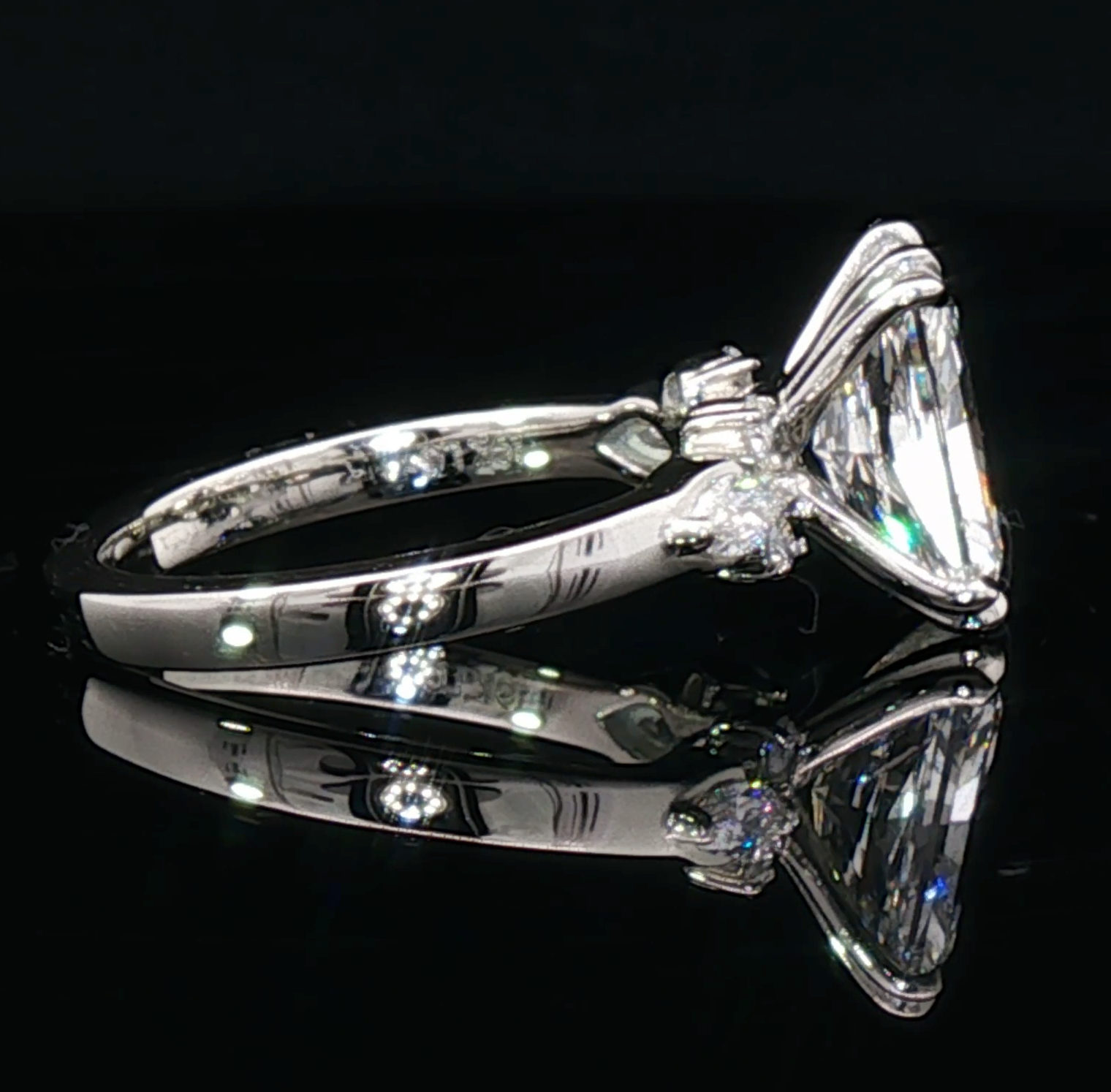 Stunning UltraFire™ Radiant Cut Diamond Engagement Ring, renowned for its brilliance and unique elongated shape. Expertly crafted, the ring showcases a composition of smaller diamonds accentuating the main stone, set in a harmonious arrangement that elevates the ring's overall elegance. The ring reflects superior polish and symmetry, enhancing its sophisticated allure.