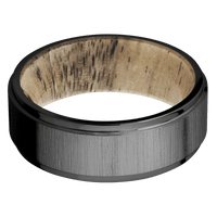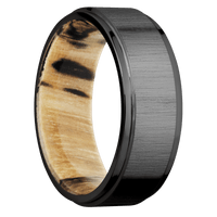 8 mm wide Flat Grooved Edges Zirconium band featuring a Spalted Tamarind sleeve.