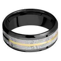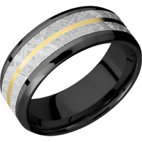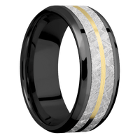 8 mm wide/Beveled/Zirconium band featuring inlays of Meteorite and 14K Yellow Gold.