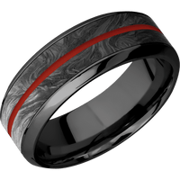 8 mm wide/High Bevel/Zirconium band featuring inlays of Forged Carbon Fiber and Red Apple.
