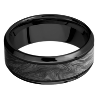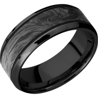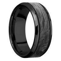 8 mm wide/Beveled/Zirconium band with one 5 mm Centered inlay of Forged Carbon Fiber.